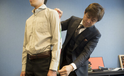 身体の十数ヶ所に及ぶ細かな採寸をします。その後のフィッティングで、撫で肩、怒り肩、反身、猫背など、体型補正を行います。体型補正できる箇所は、国内最高峰の工場で数十ヶ所、1ミリ単位での補正が可能です。